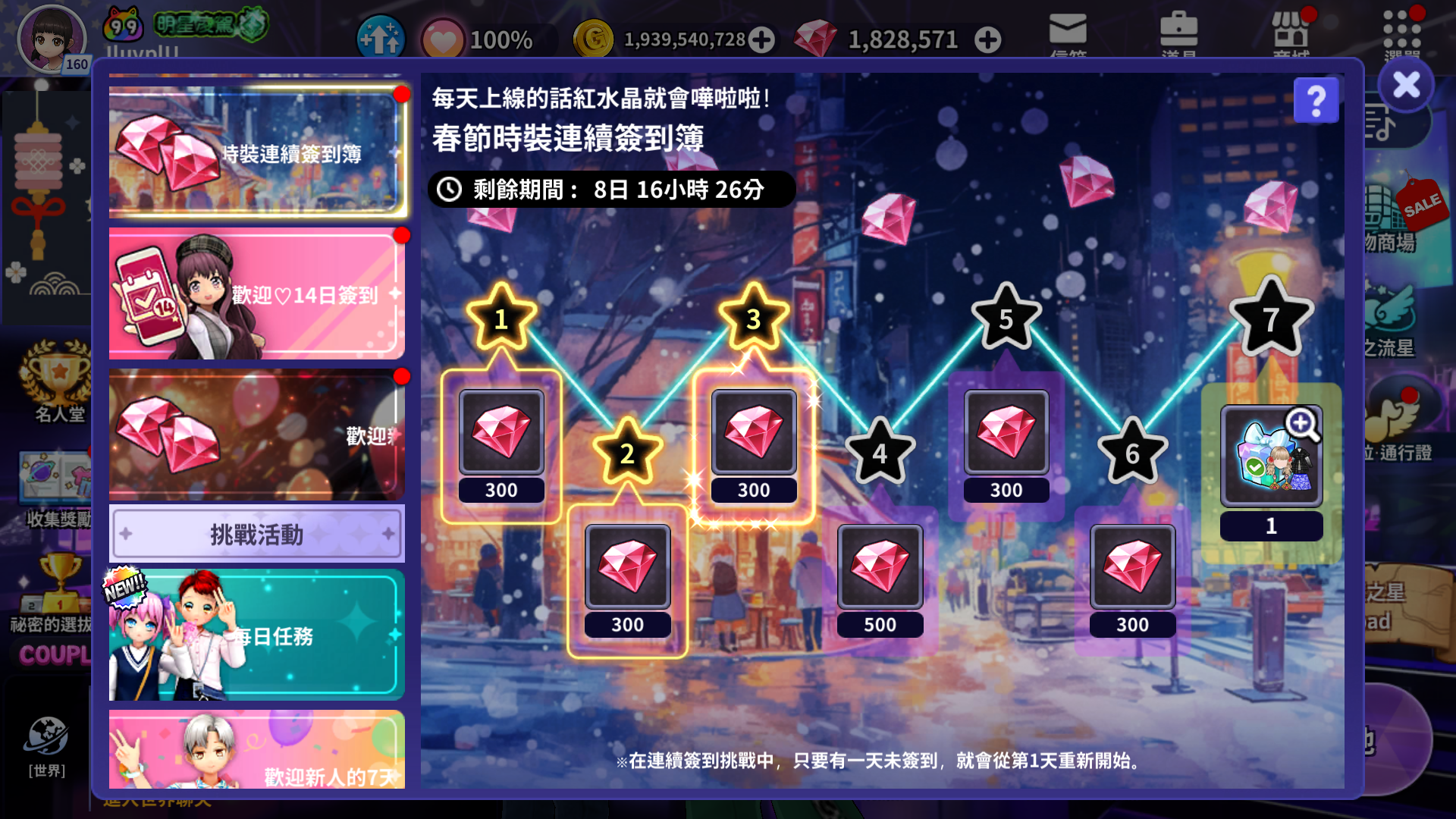 - 連續簽到時可以獲得下一次簽到獎勵。