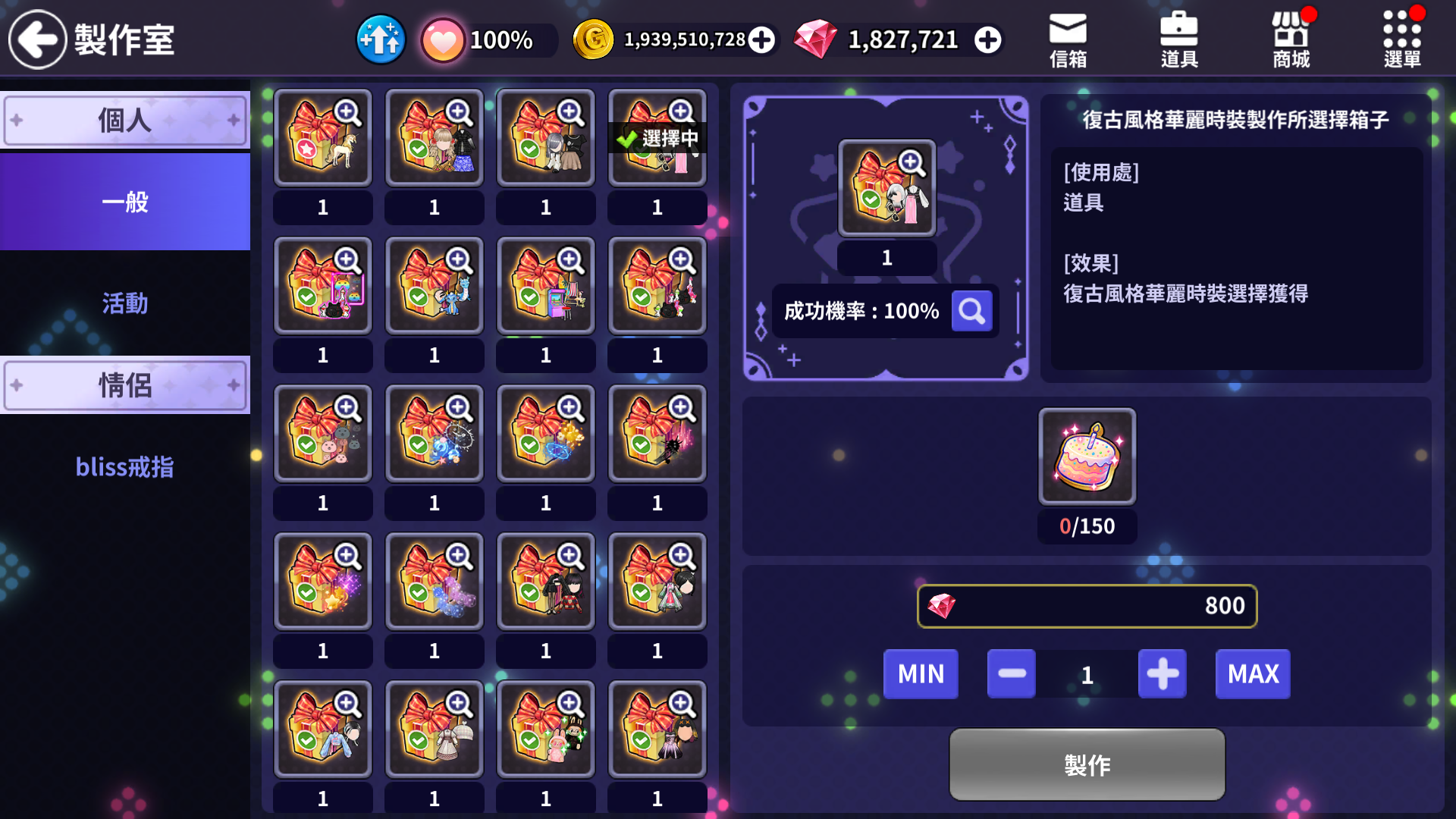 1 | 로맨틱 무드 코스튬 선택 박스 | 1 | 150 | 800 | 100% | 0% | 0% | |
