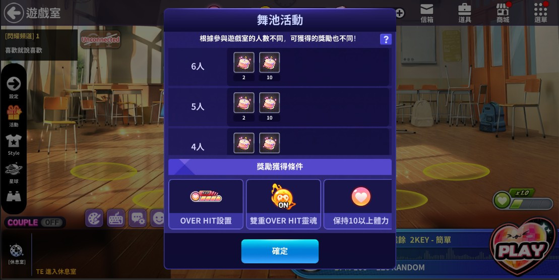 遊戲模式 | 人數 | BPM | 加助器 | OVER HIT | Double OVER HIT Soul | 最少體力 | Min 明星等級 | Max 明星等級 |