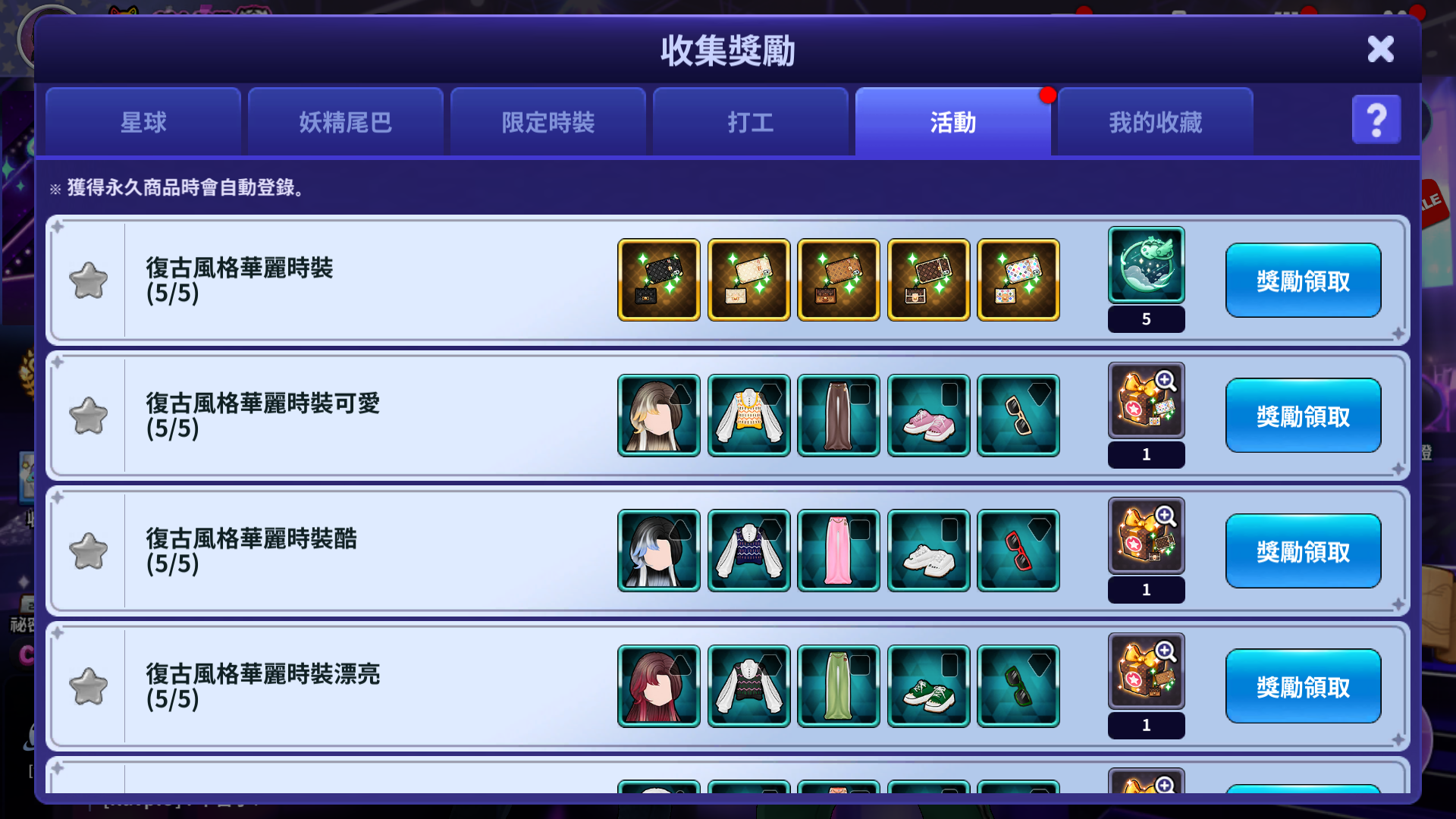 - 獲得符合每個收集獎勵的時裝,當符合條件時,就可以獲得收集獎勵。