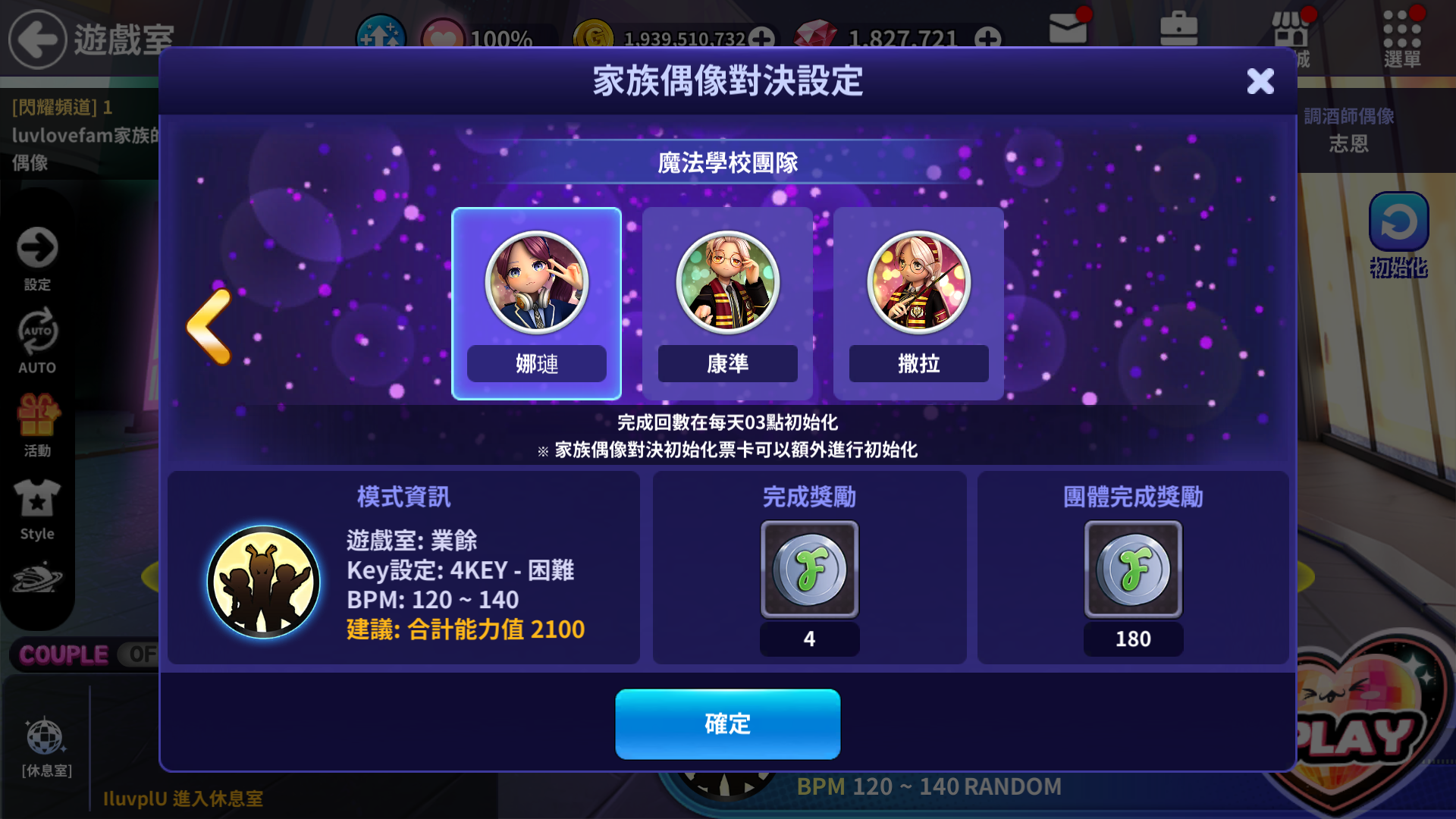 - 完成偶像對決就可以獲得團體完成獎勵2倍獎勵。