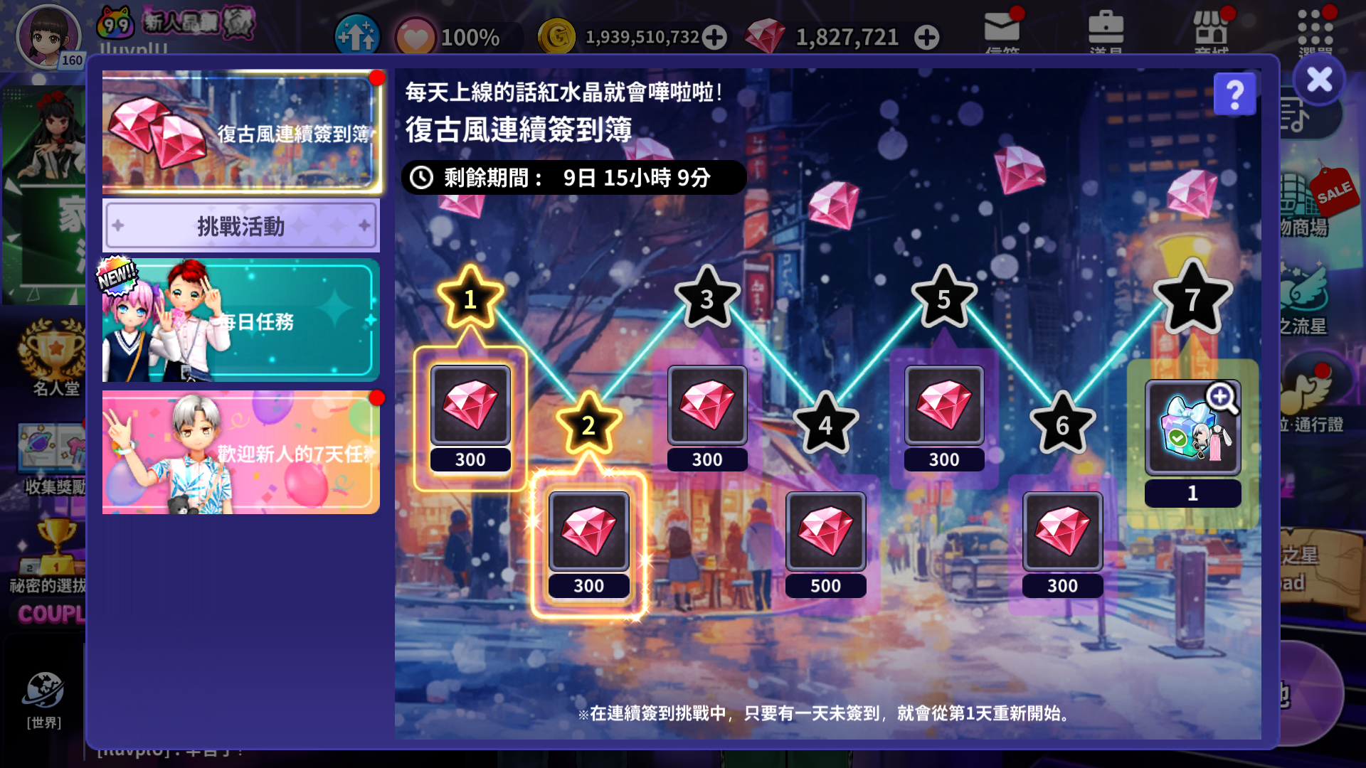 - 連續簽到時可以獲得下一次簽到獎勵。