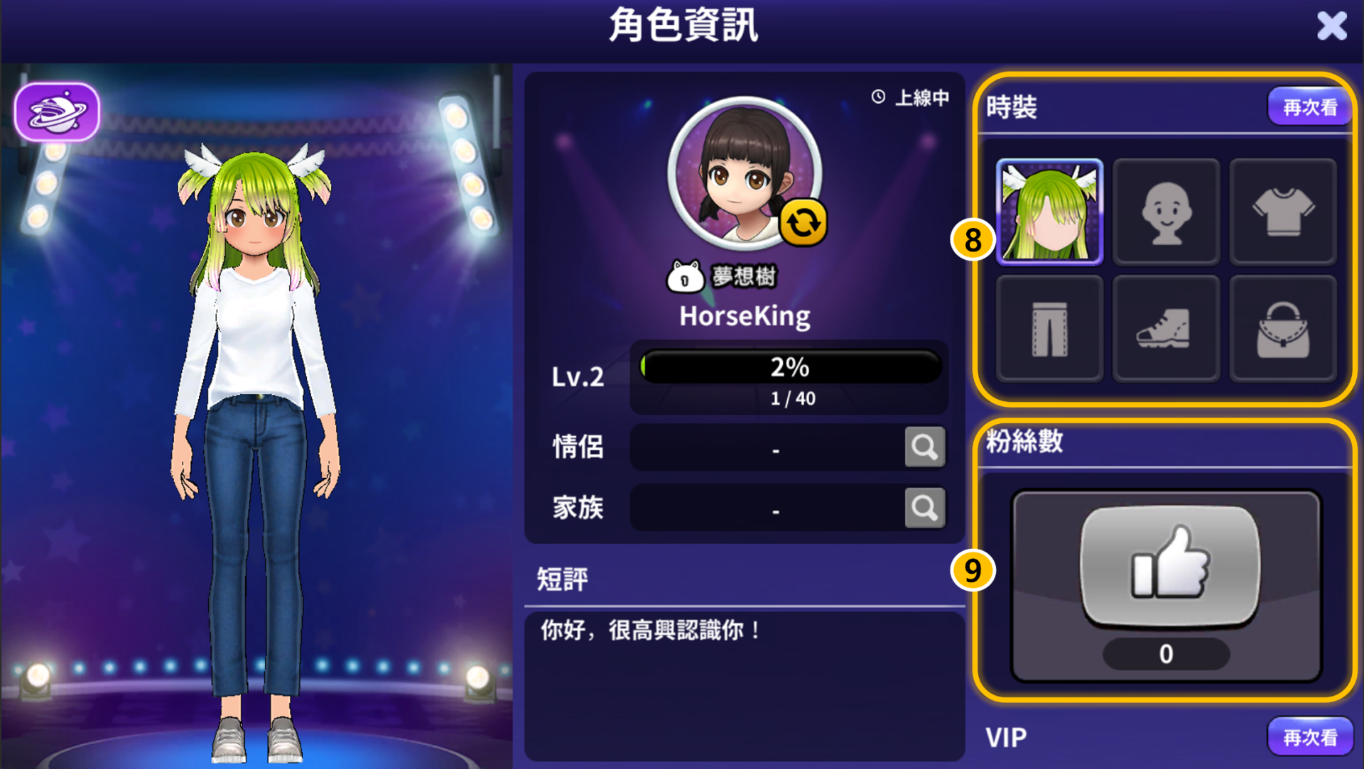 ⑧ 時裝: 可以查看我目前穿著的時裝資訊。