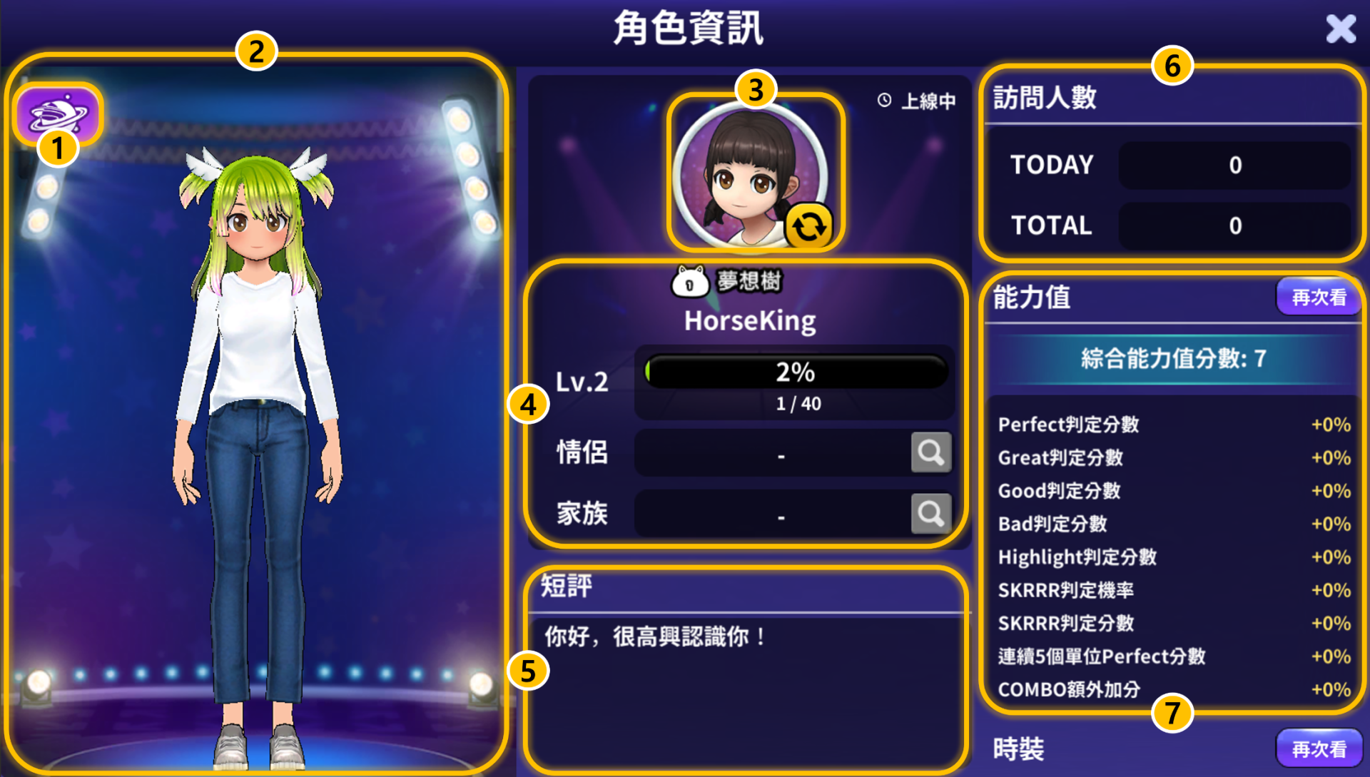 ⑦ 能力值: 現在可以確認適用於我的能力值的數值和綜合能力值分數。