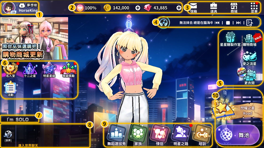 * 舞池是可以與其他玩家一起玩的地方,可以以多種模式進行遊戲。