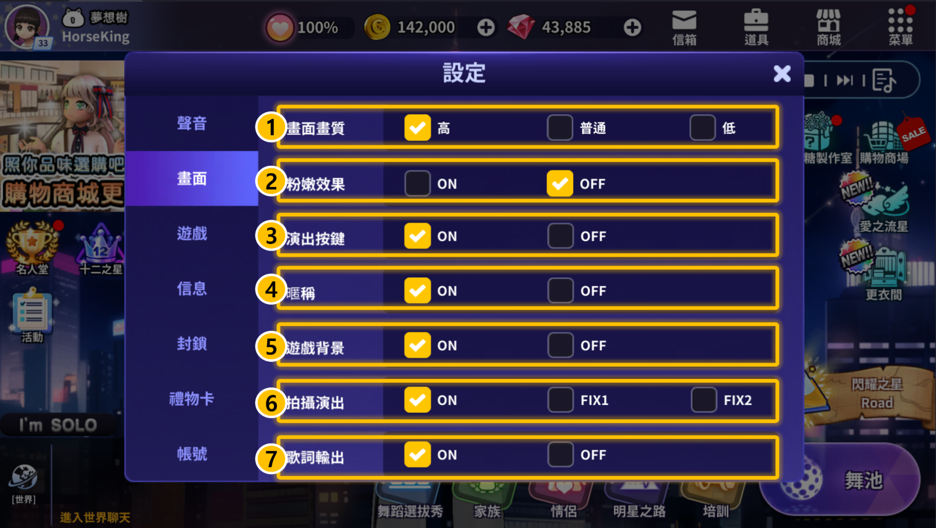 ④ 玩遊戲時是否顯示角色暱稱on/off。