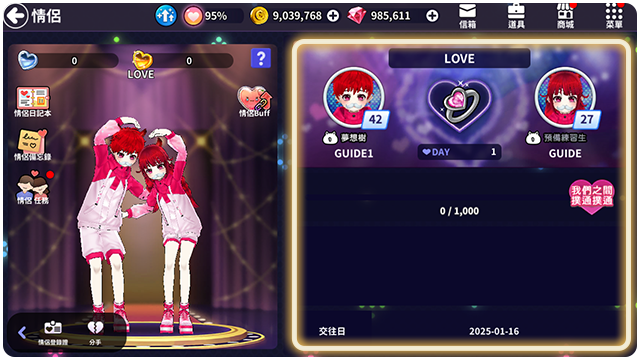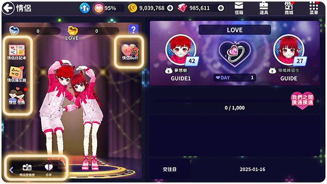 ■ 情侶任務: 可以確認情侶任務和情侶彩票。