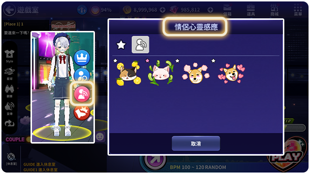 ■ 在遊戲室選擇我的情侶角色,就會出現情侶心靈感應按鈕。