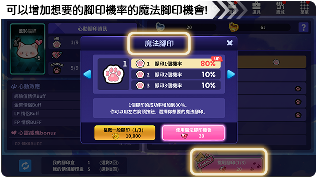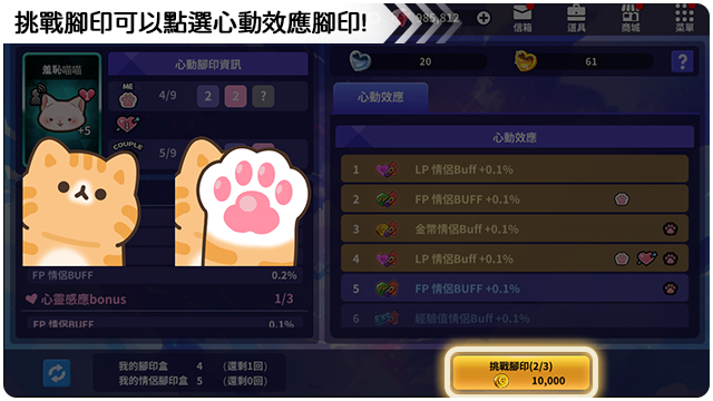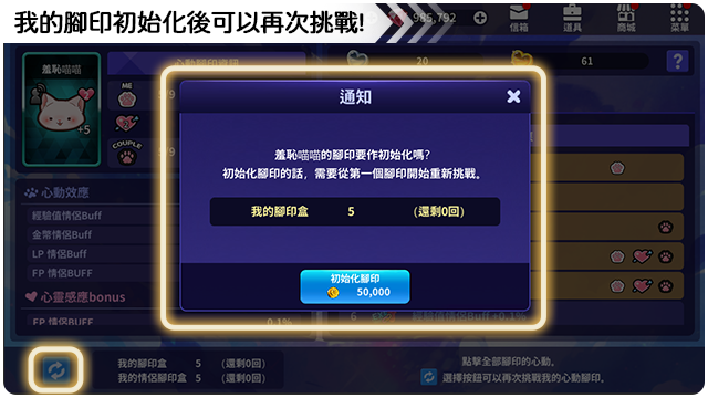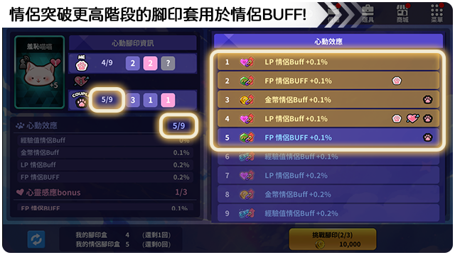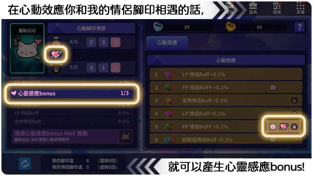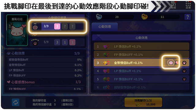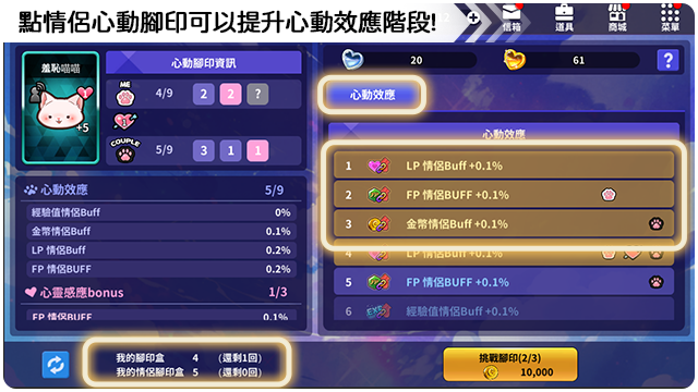 ■ 在情侶心動Buff畫面中挑戰腳印,可以提高心動效果階段。