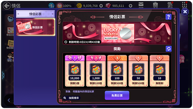 ■ 僅限情侶玩家可以使用的情侶彩票獲得獎勵。