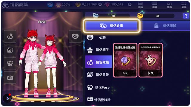 ■ 在情侶倉庫確認情侶一起擁有的商品,並穿戴情侶商品來裝飾情侶。