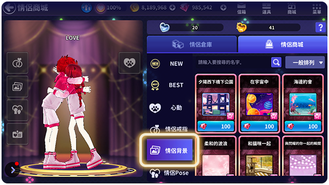 ■ 情侶背景商品是在套用時,添加情侶的各種背景。