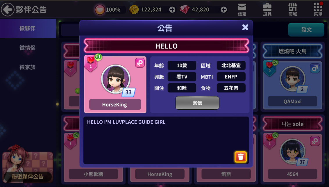 ④ 可以確認其他玩家的貼文(包括本人貼文),點擊時可以查看寫該貼文的玩家資訊/貼文/舉報。