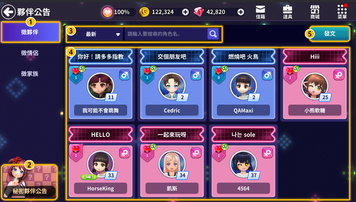 ■ 可通過夥伴公告欄尋找夥伴/情侶/家族。