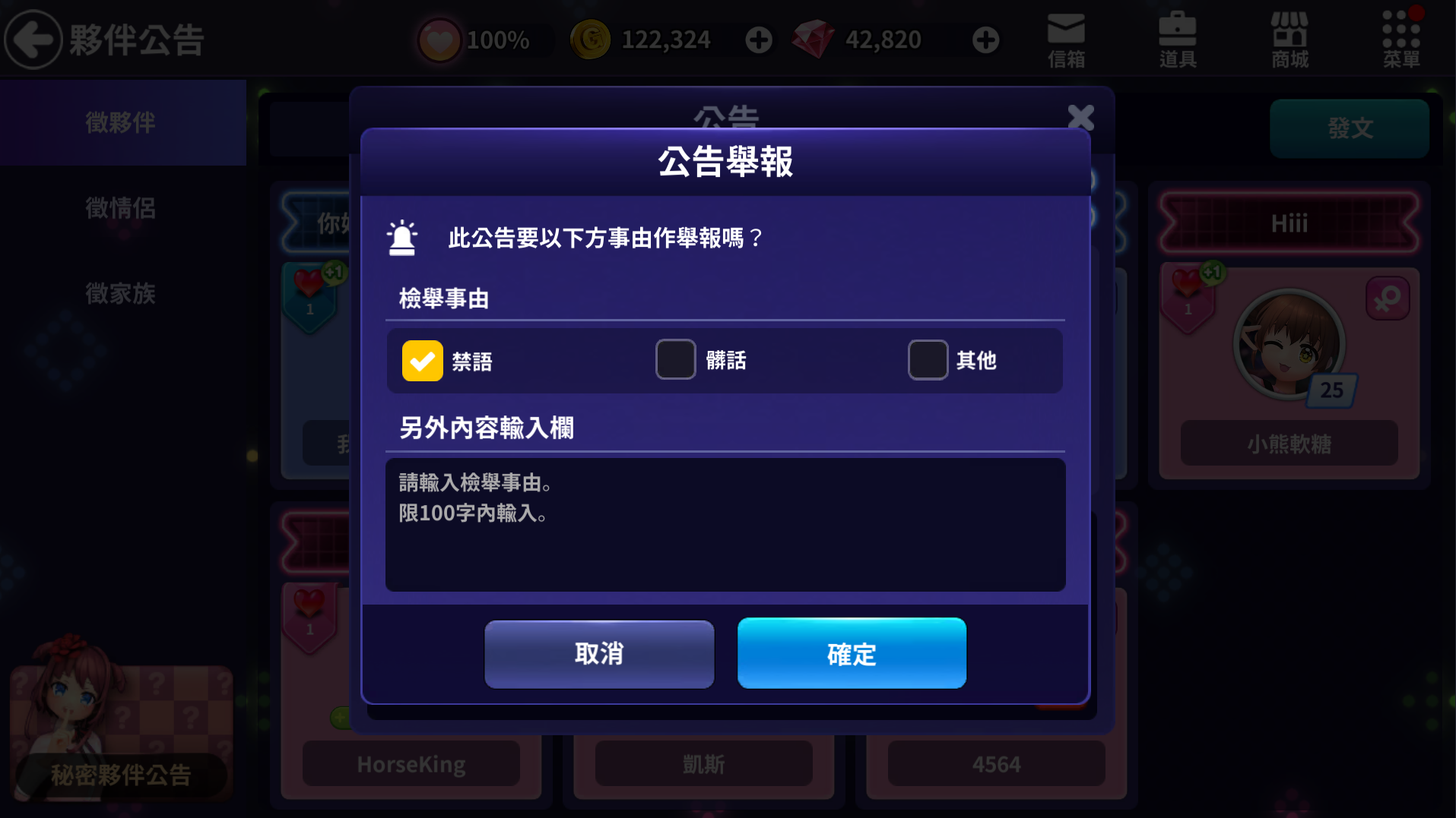 ※ 在密夥伴公告內也可以發送信件,發送時以匿名舞者發送。