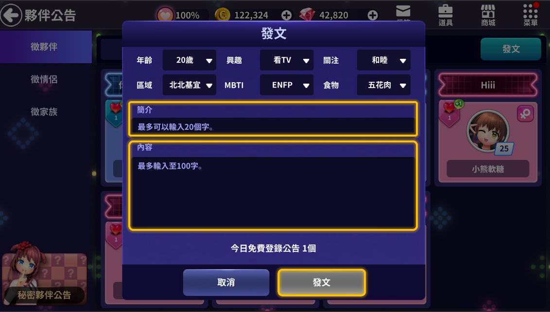 ⑤ 每個公告欄每天可以免費貼文一次,如果持有[貼文道具],就可以追加貼文。