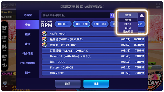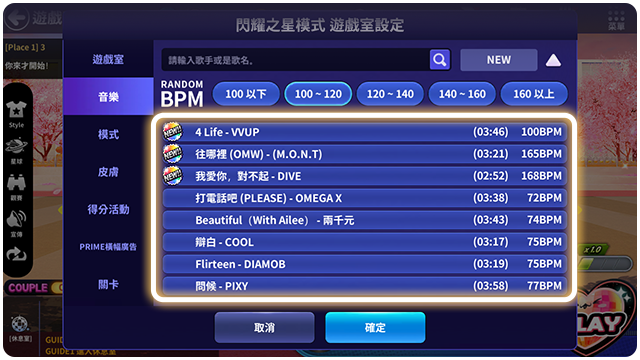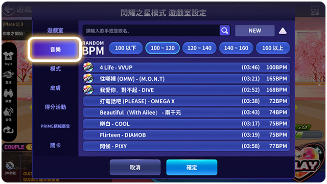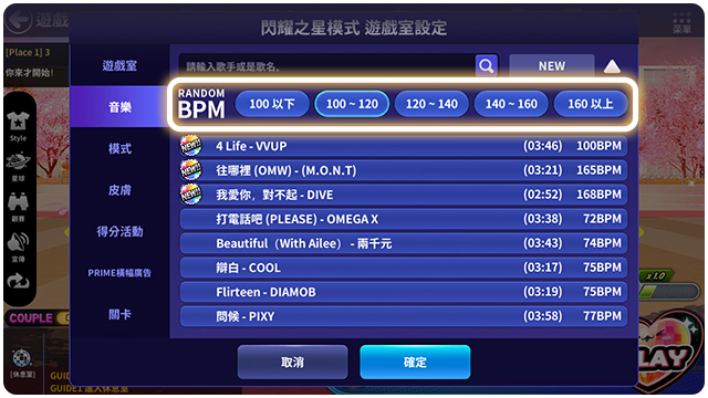 ■ RANDOM BPM: 選擇想要的BPM音樂中,隨機播放音樂進行遊玩。