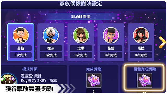 ■ 同一偶像團體的5名NPC全部完成1次以上獲得團體完成獎勵。