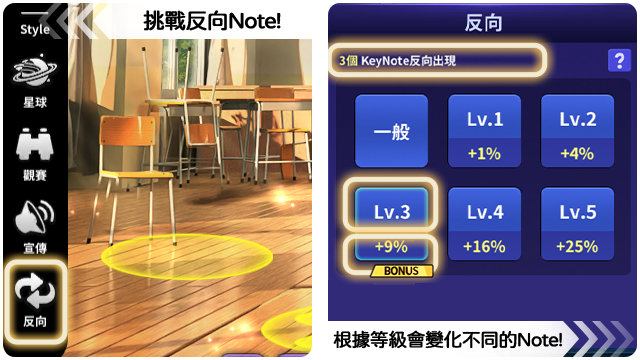 ■ 根據反向設置等級,出現的反向note數量也不同。