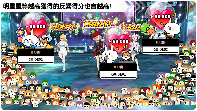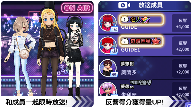 ■ 根據進行直播秀放送舞者們的明星星級可以獲得反響分數。