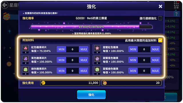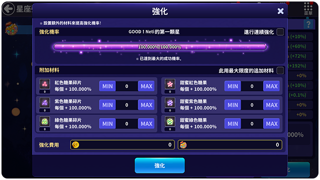 ■ 每次強化的時候都會消耗星星糖和金幣。
