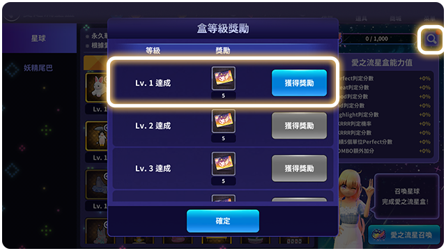 ■ 愛之流星盒等級提升時可以獲得獎勵。