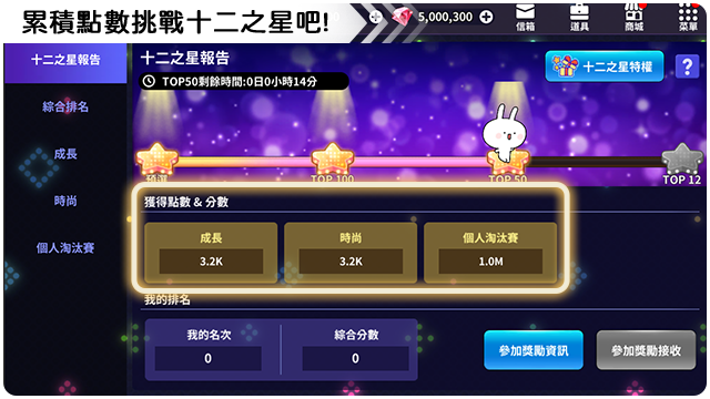 ■ 在規定的時間內獲得成長、時尚、舞蹈比賽、人氣投票分數,就可以積累積分。