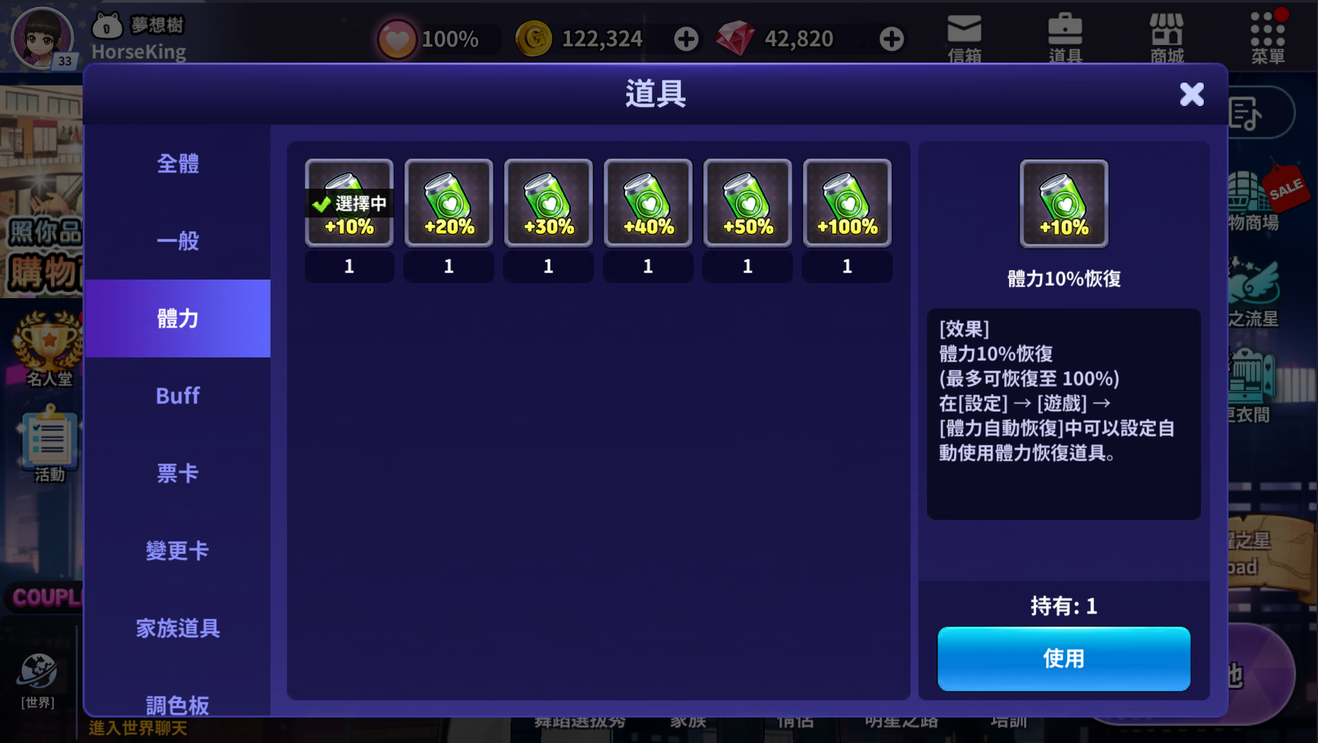 ■ 購買或持有的體力恢復道具可以在[道具]- [體力]標籤上確認,