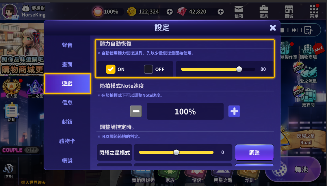 ■ [主畫面] - [選單] - [設定] - [遊戲] 標籤中可以設定體力自動恢復ON/OFF。