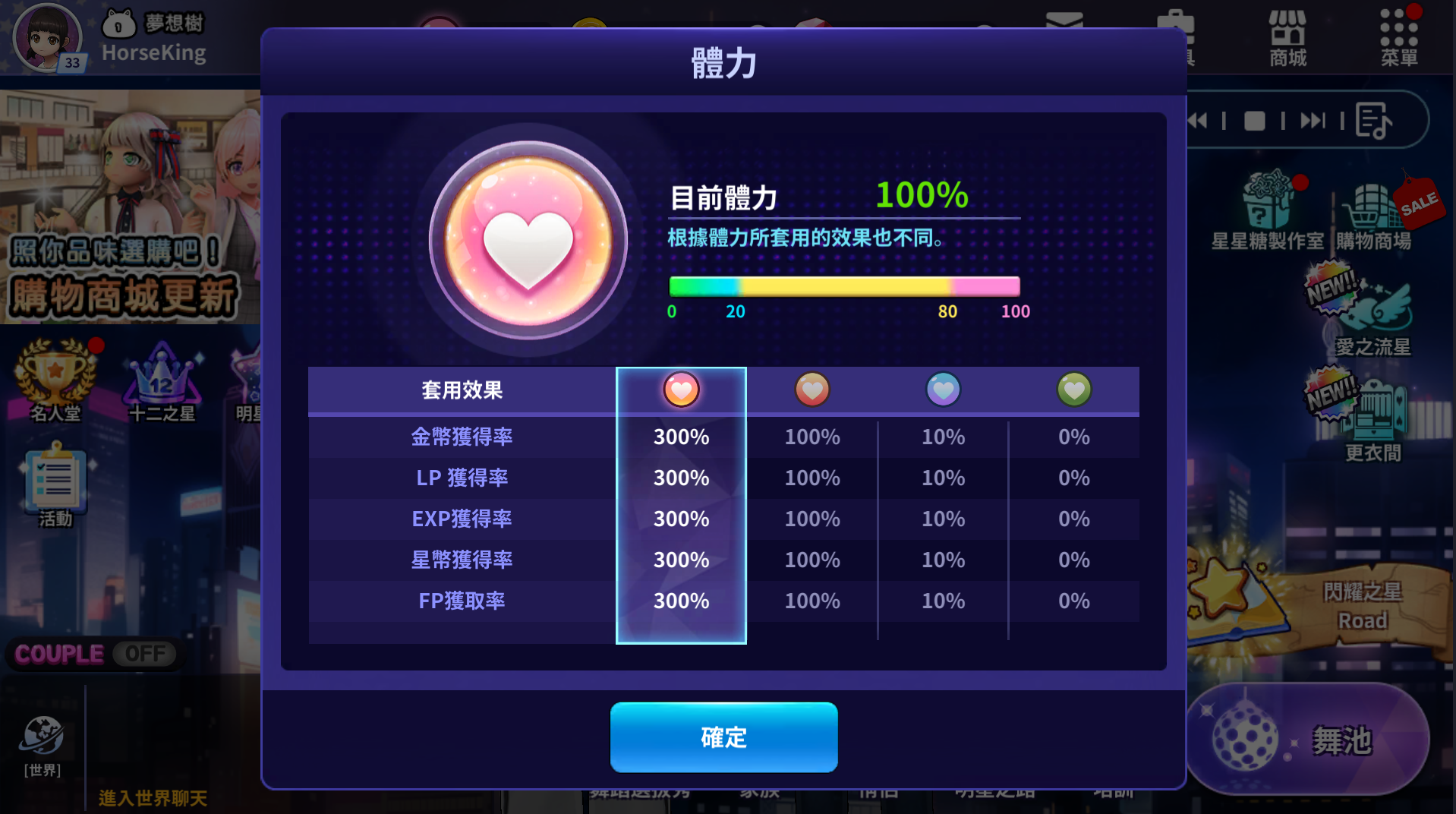 ■ 體力是根據本人目前的體力,在遊戲進行後獲得的獎勵獲得率增加的系統。