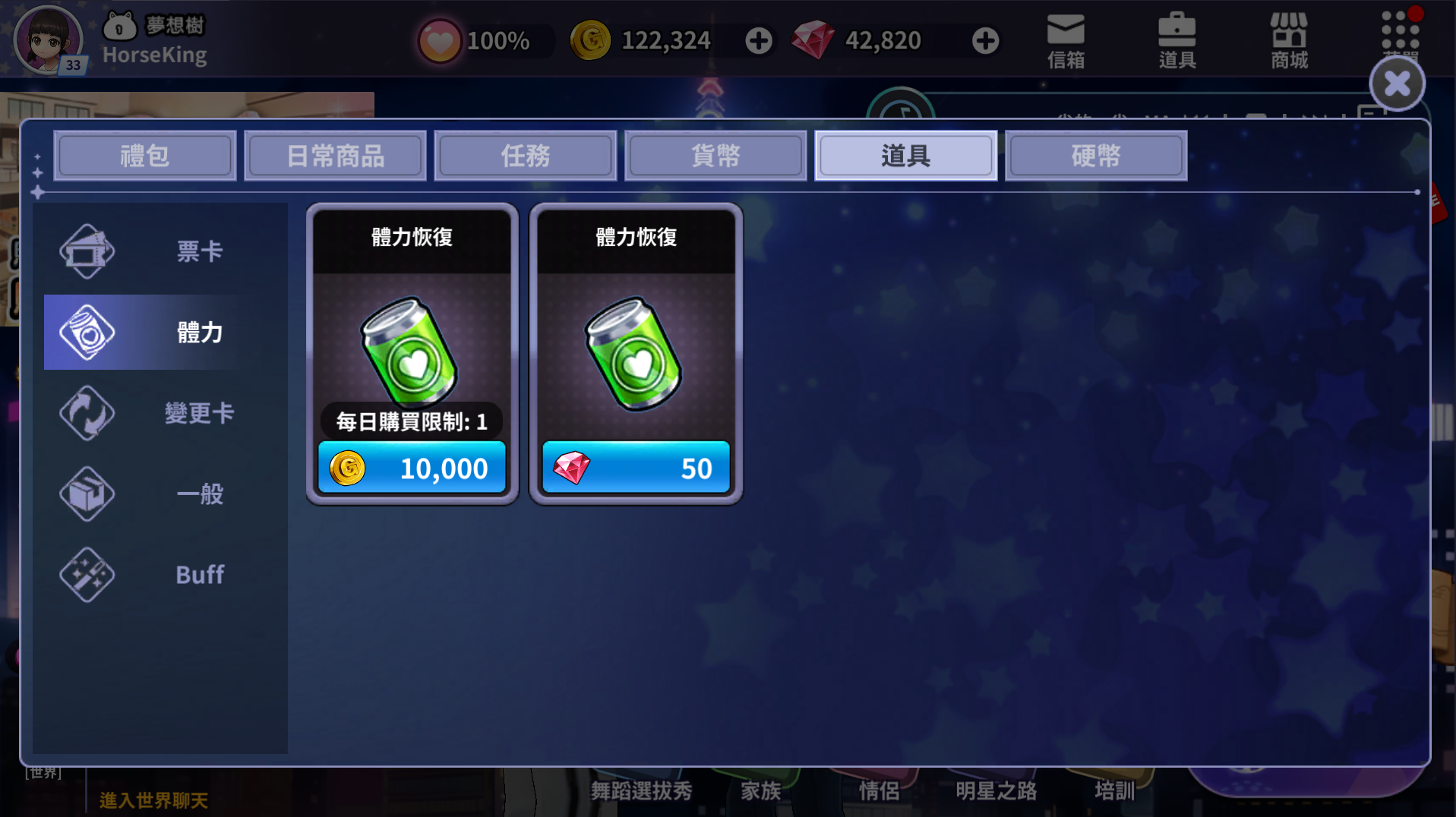 ■ [主畫面] - [商城] - [道具] - [體力] 標籤使用貨幣就可以購買體力恢復道具。