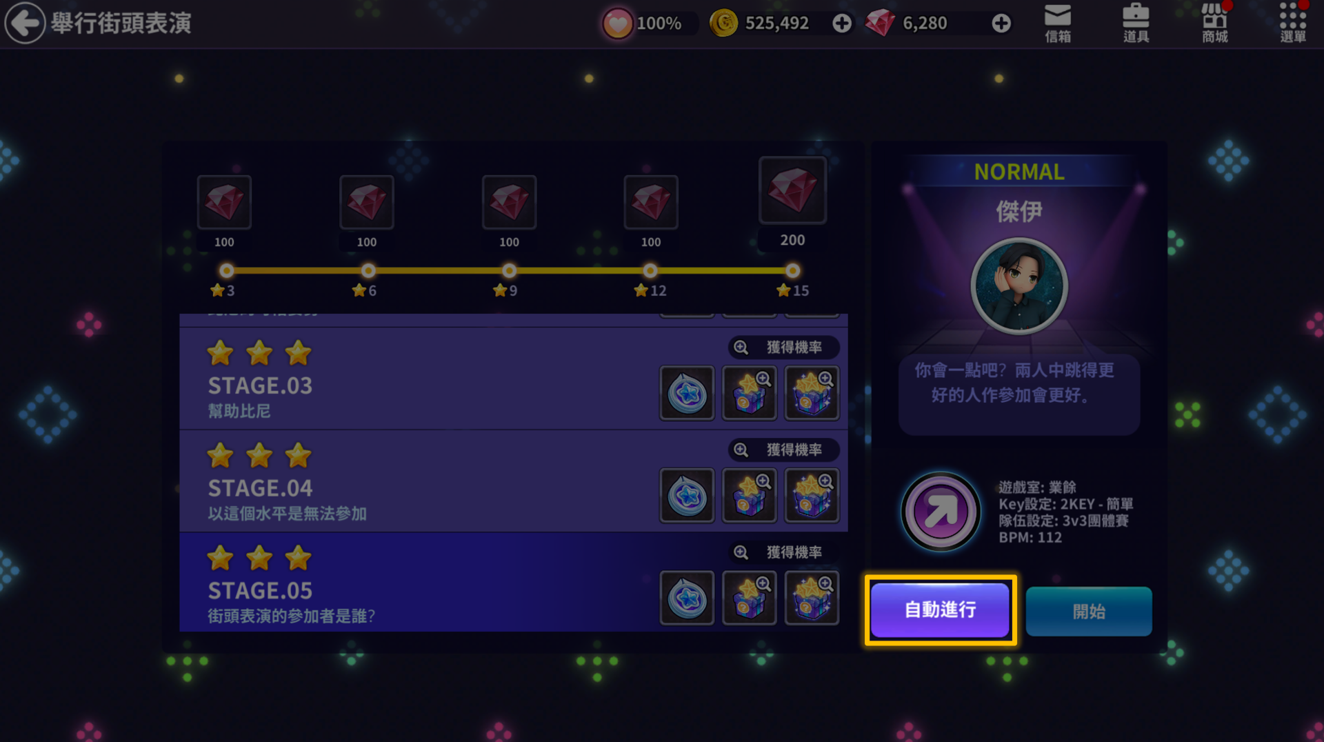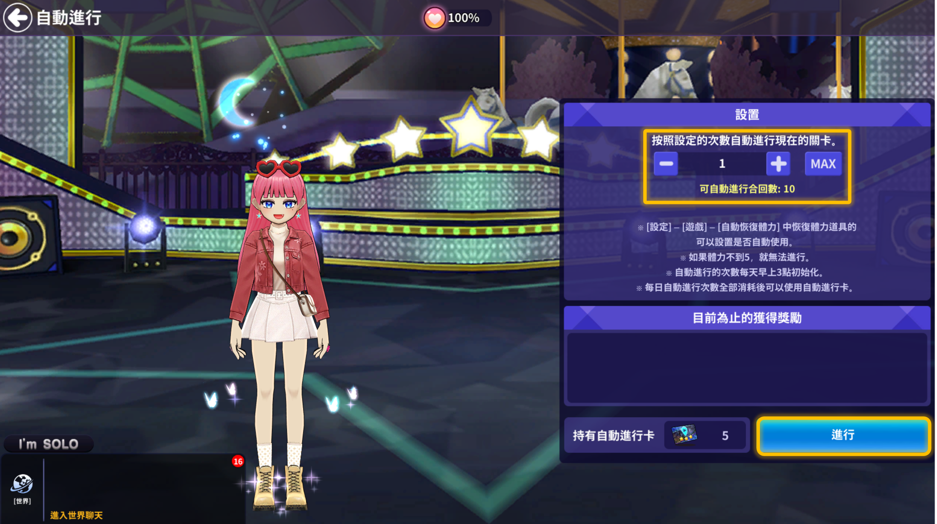 - 選擇想要進行的關卡後點擊[自動進行]按鈕。