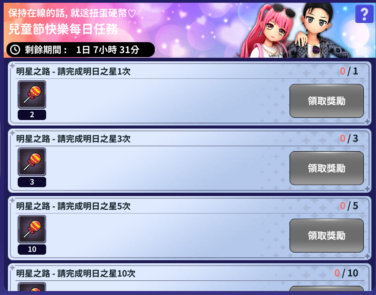- [主畫面] - [選單] - [活動] - [驚喜活動] - [兒童節快樂每日任務] 。