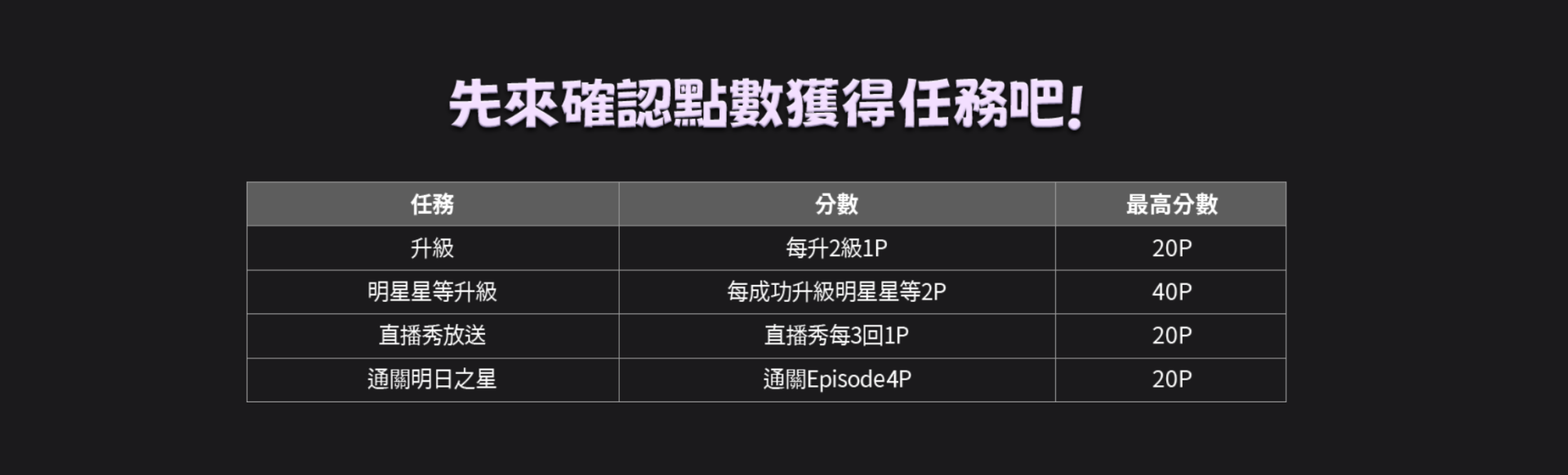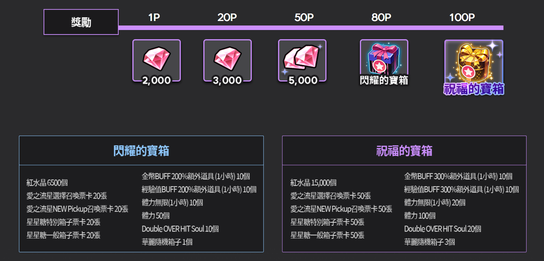* 合計點數為20P就可以獲得20P獎勵(紅水晶3000個)