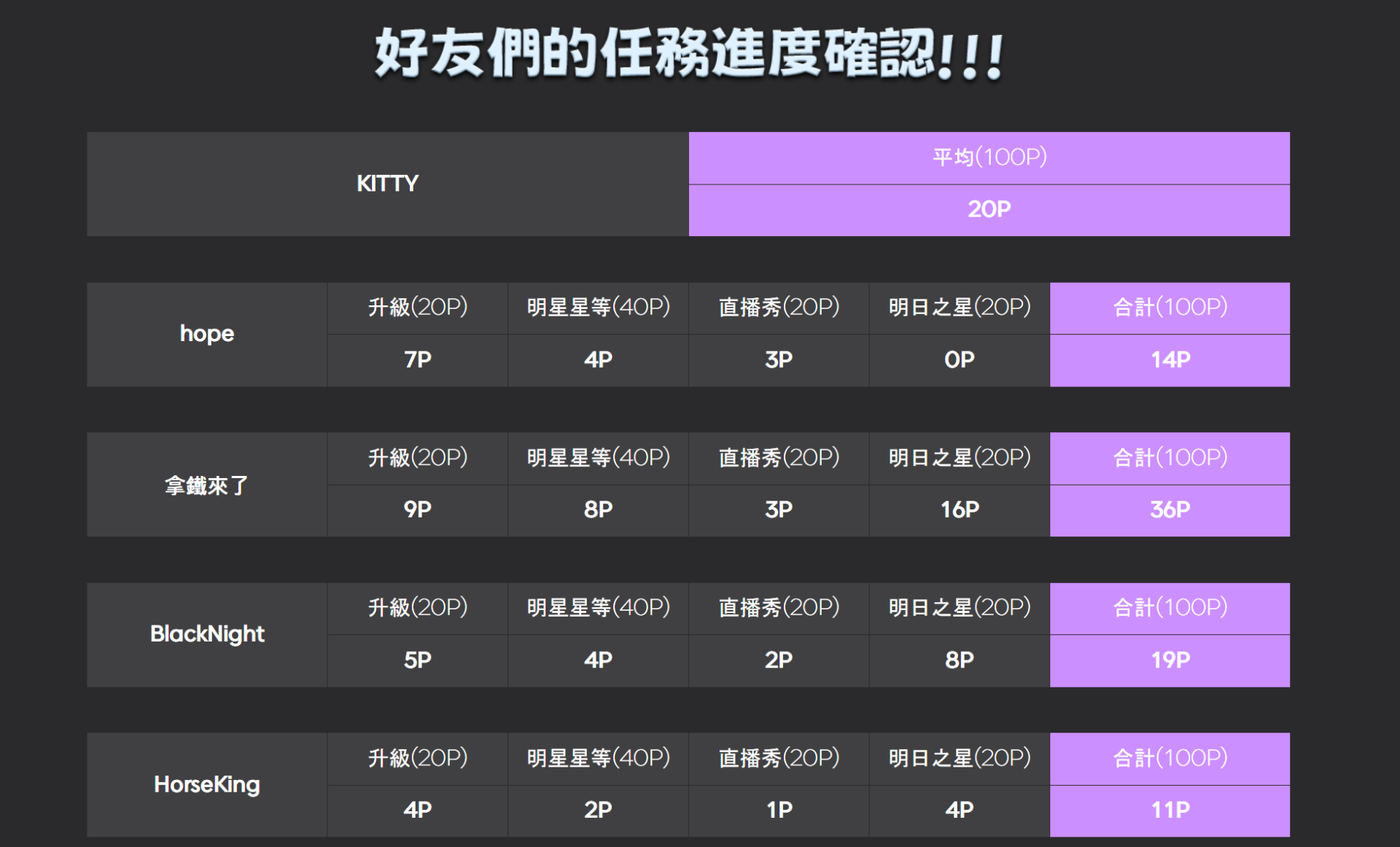 * 如圖上,好友四位各別的合計點數加總除以四位=平均點數為20P