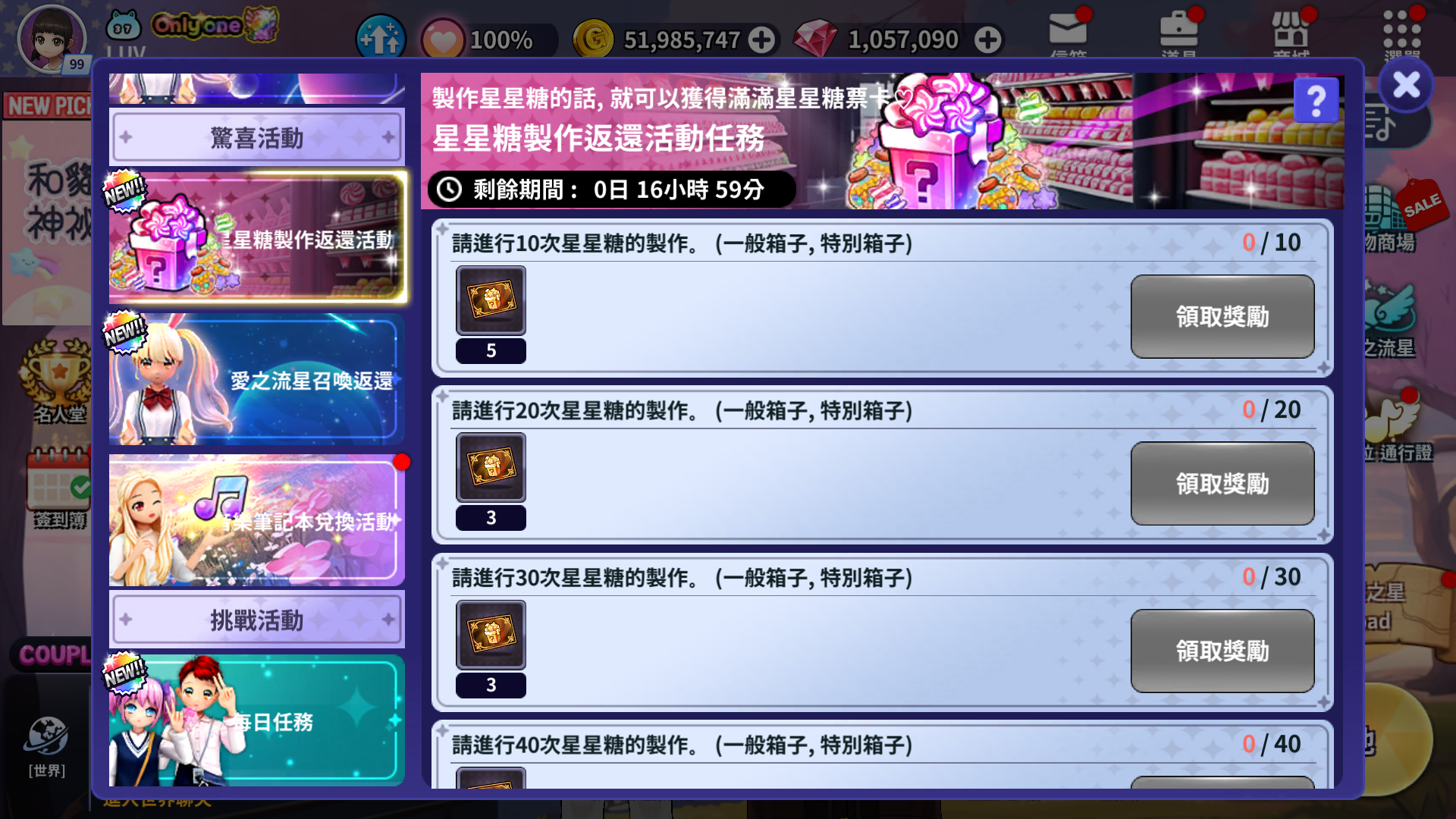 | 星星糖製作(一般,特別) 100回 | 星星糖一般箱子票卡 3個 | 愛之流星召喚 100回 | 愛之流星選擇召喚票卡 3個 |