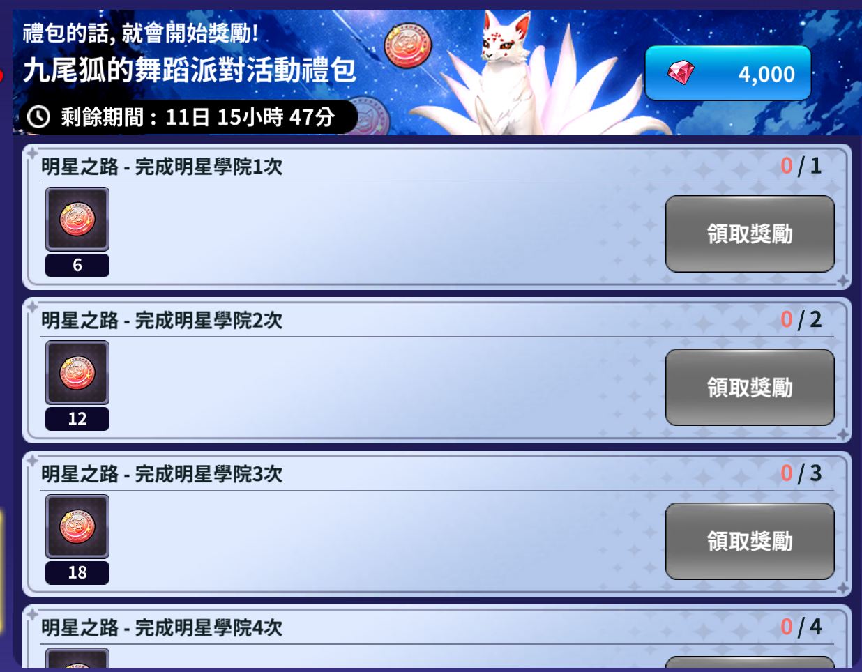 | 明星學院進行 4回 | 九尾狐扭蛋硬幣 8個 |