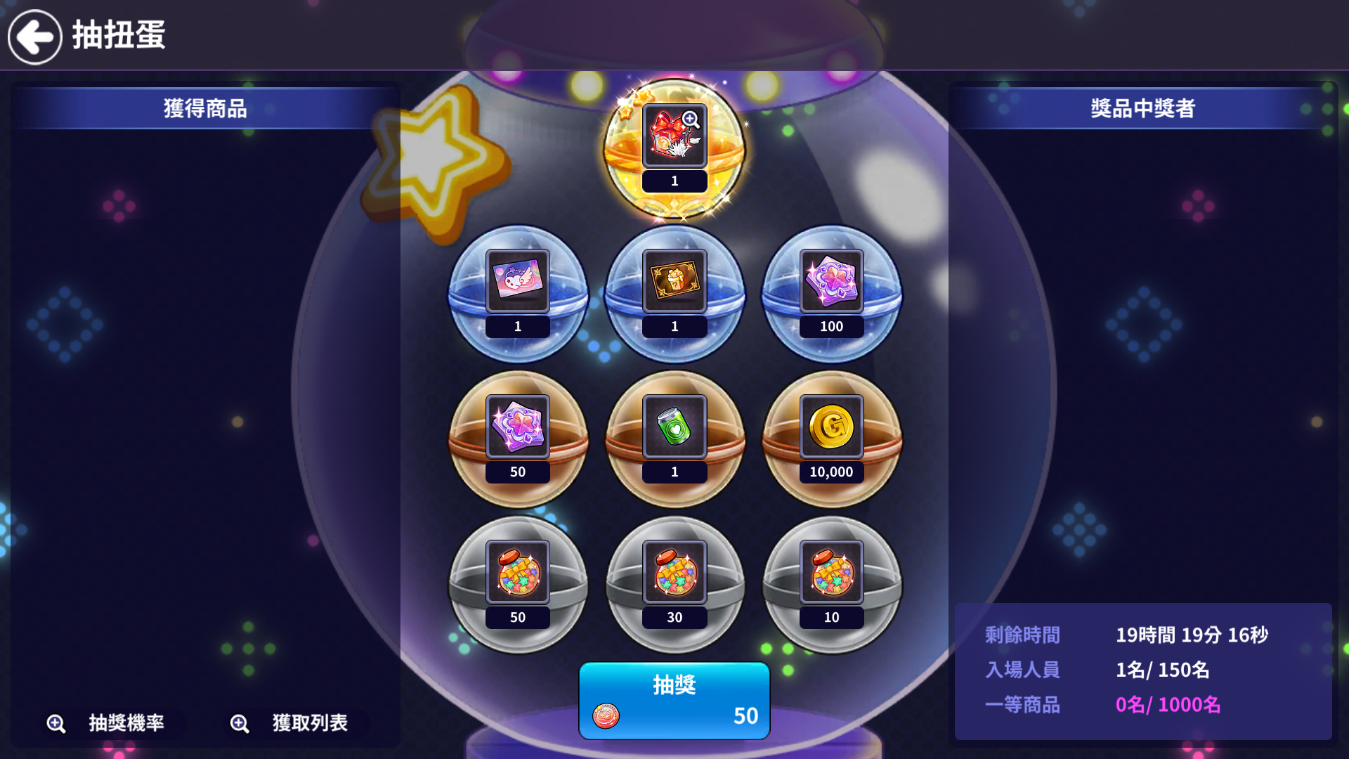 - 1等商品限定的數量全部消耗或進行時間截止時,抽扭蛋也跟著結束。