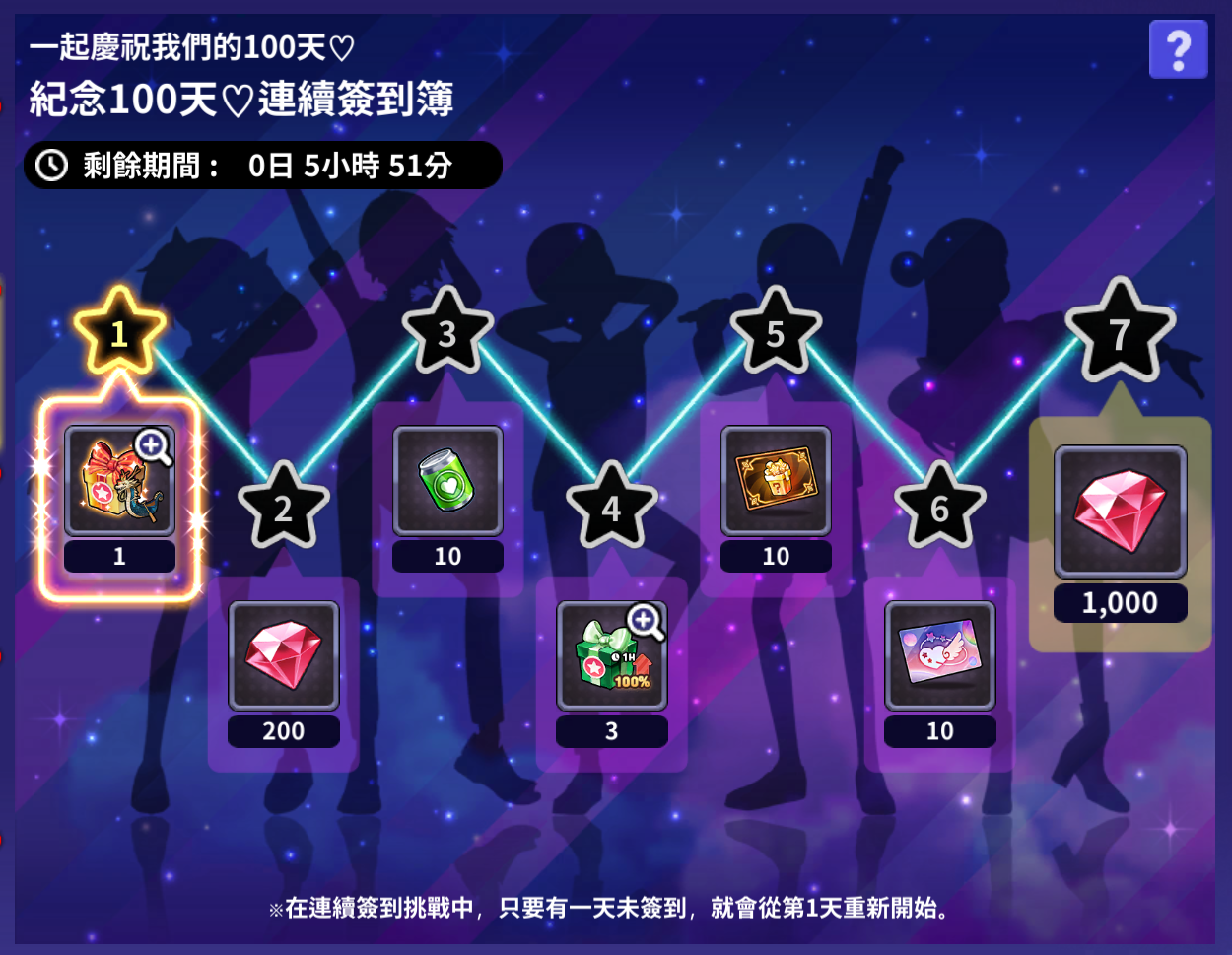 - 連續簽到時可以獲得下一次簽到獎勵。