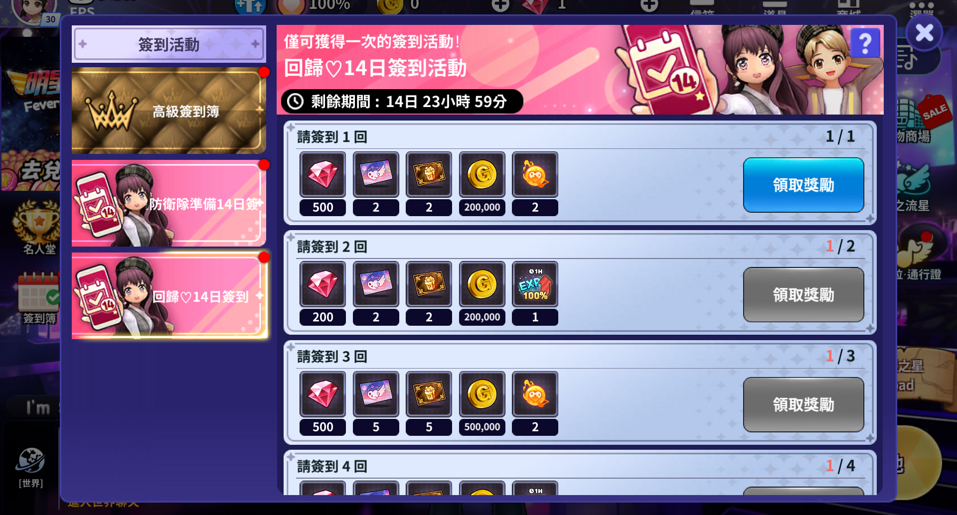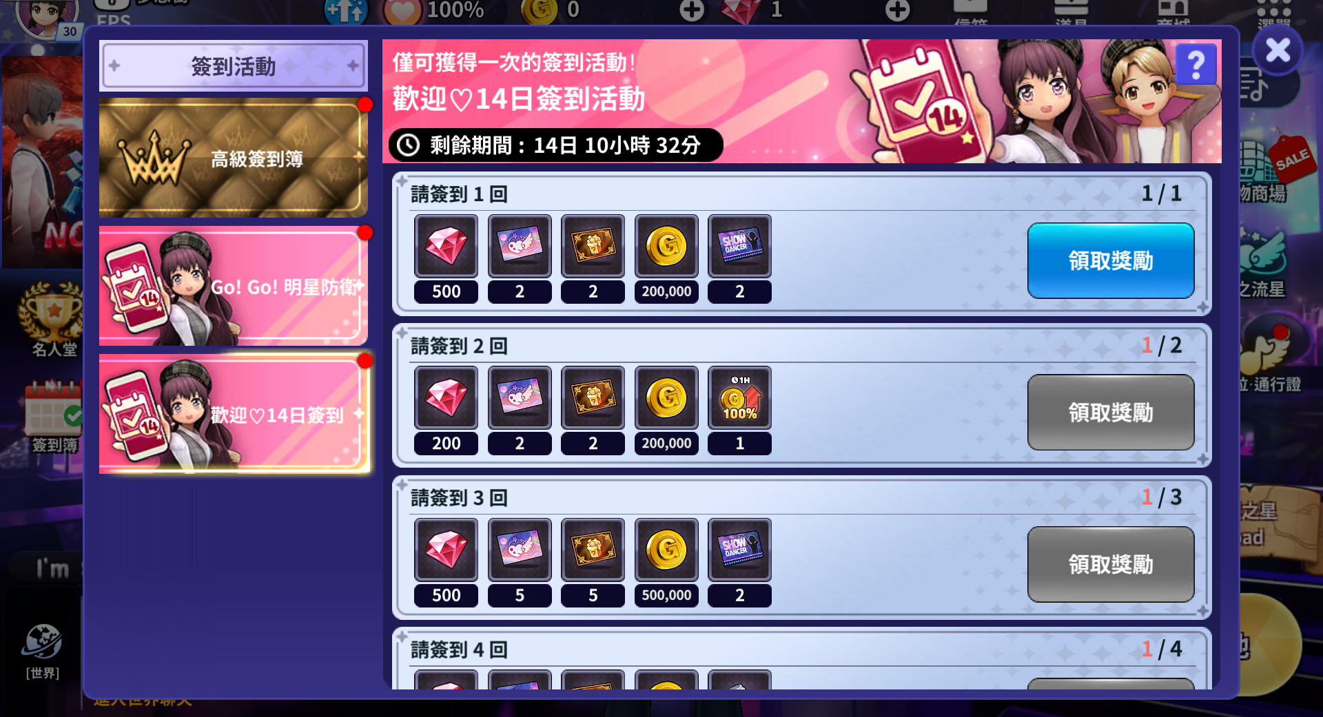 - 이벤트 기간 동안 14일간의 출석일에 따른 보상을 획득할 수 있습니다.