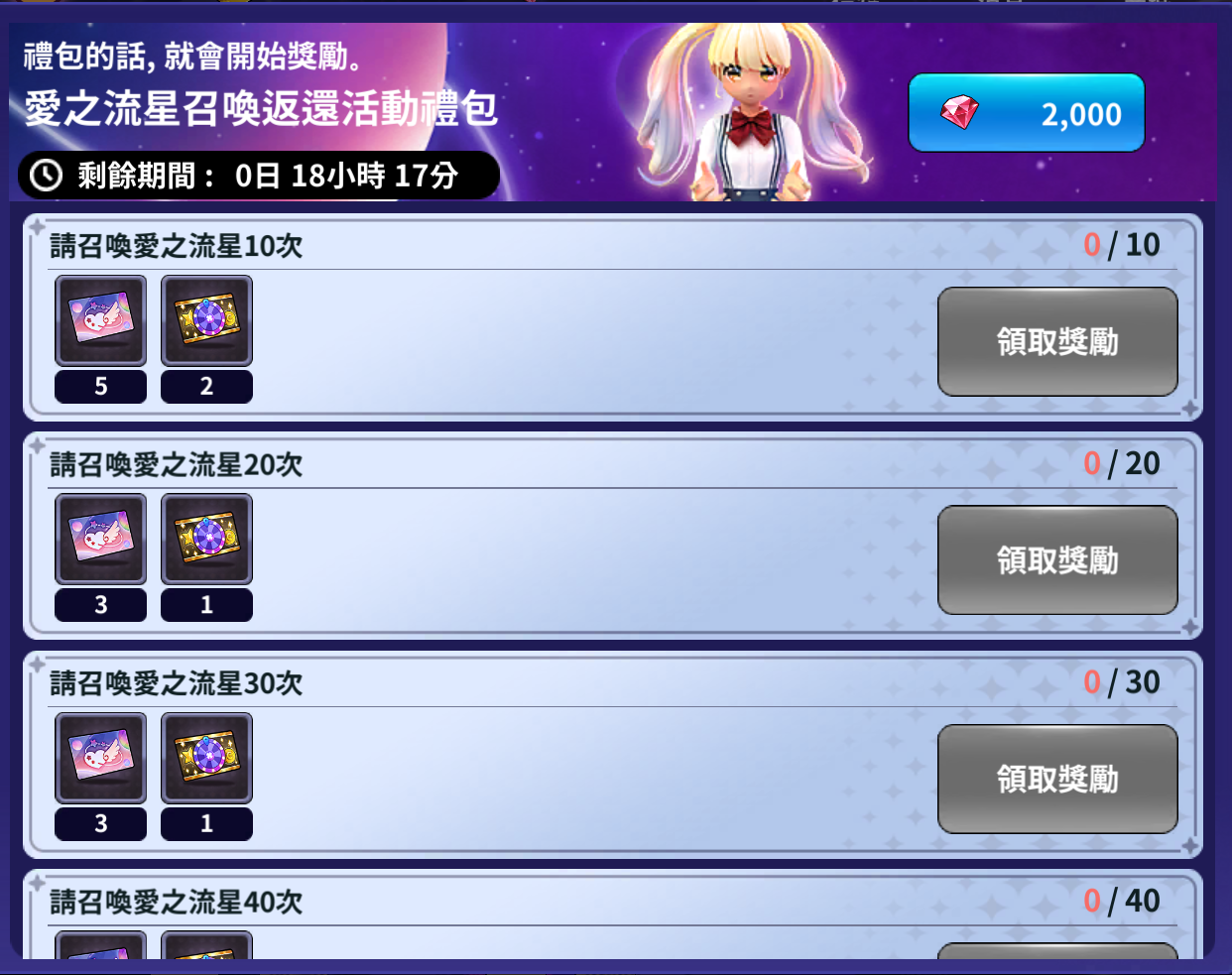 - 嘗試強化星座和進行愛之流星召喚,達成目標任務次數時可以獲得獎勵。