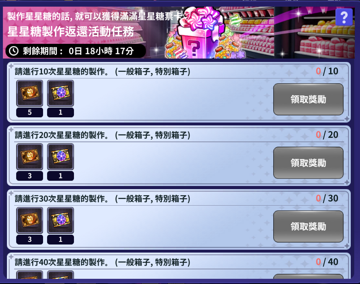 | 星星糖製作(一般,特別) 40回 | 星星糖一般箱子票卡 3個 럭키 룰렛 티켓 1개 | 愛之流星召喚 40回 | 愛之流星選擇召喚票卡 3個 럭키 룰렛 티켓 1개 |