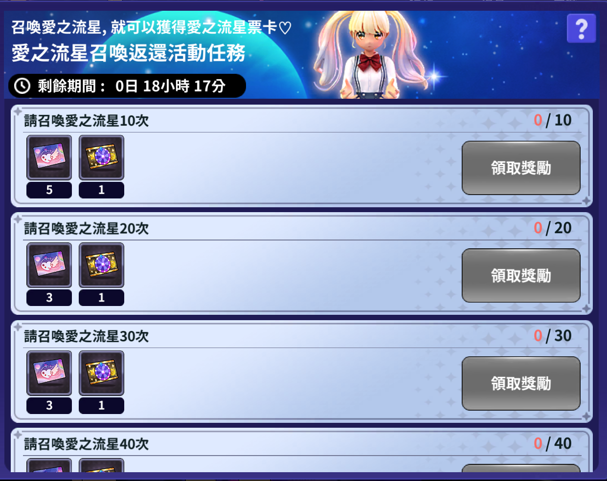 - 活動期間嘗試強化星座及召喚愛之流星,達成目標任務次數時可獲得獎勵。