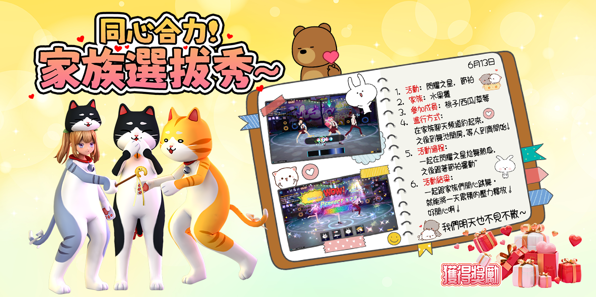 4. 活動規則及進行方式:在家族聊天頻道約起來, 之後到舞池開房, 換上團服就開始CM們的閃耀演唱會!