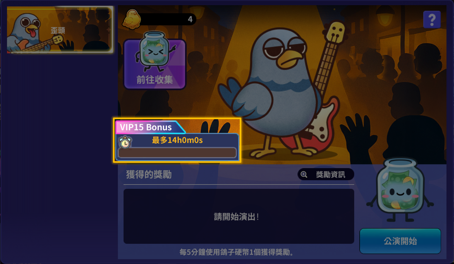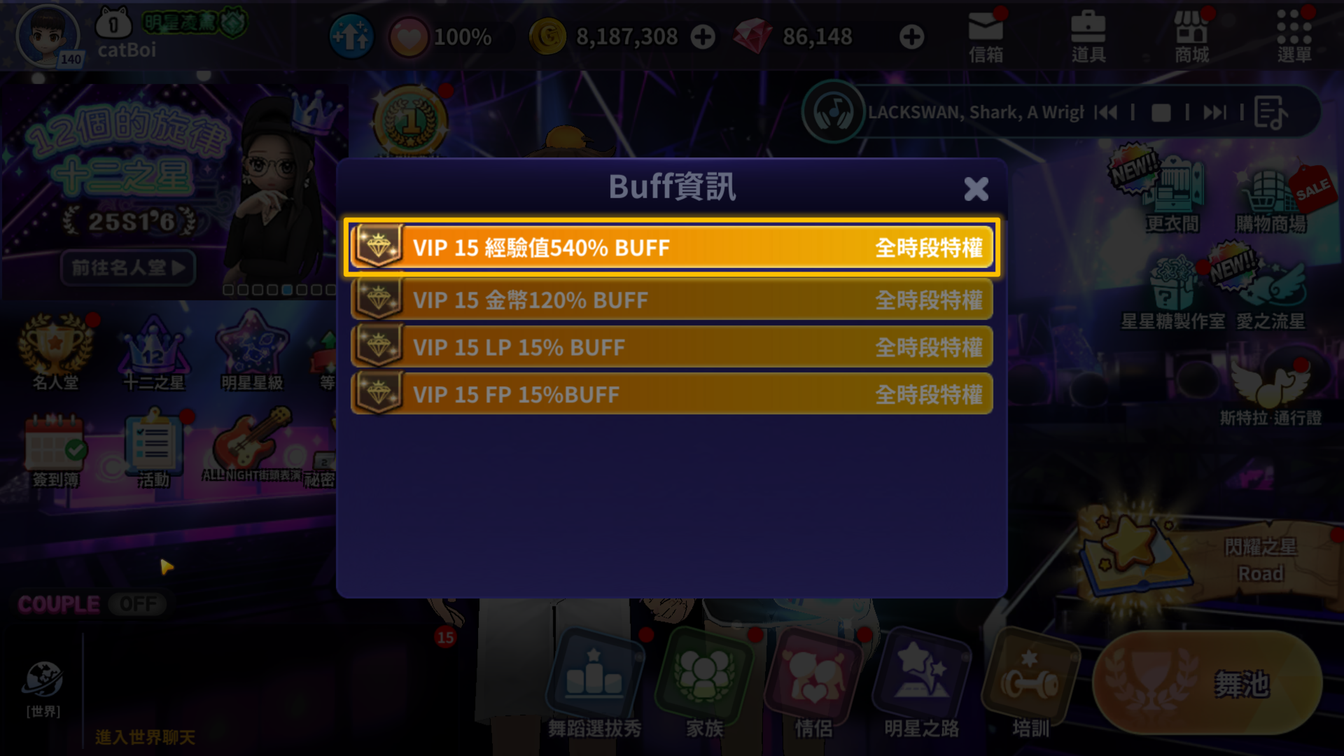 - VIP 등급 혜택 중, 경험치 획득량 버프 500%, 올나잇 버스킹 진행 시간 100%로 증가됩니다.