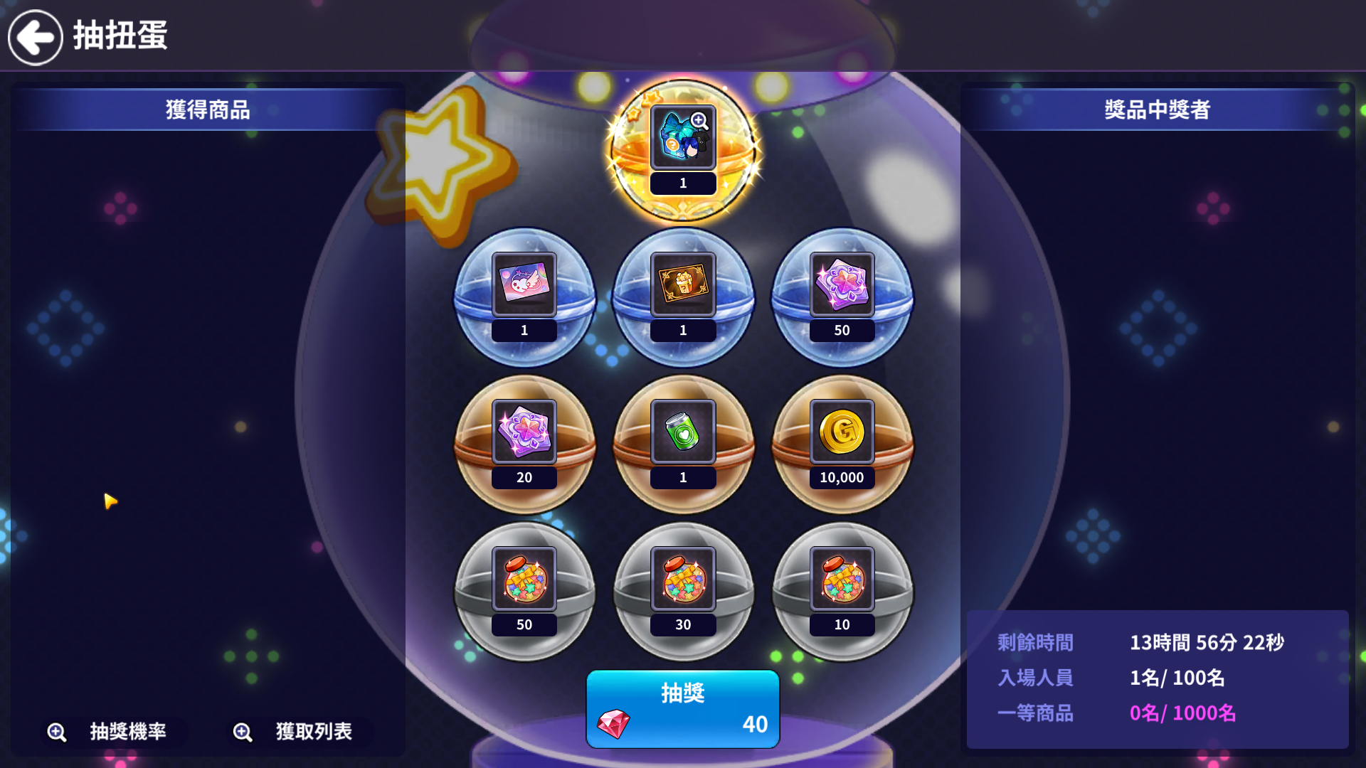 - 入場後可以用紅水晶來抽扭蛋。