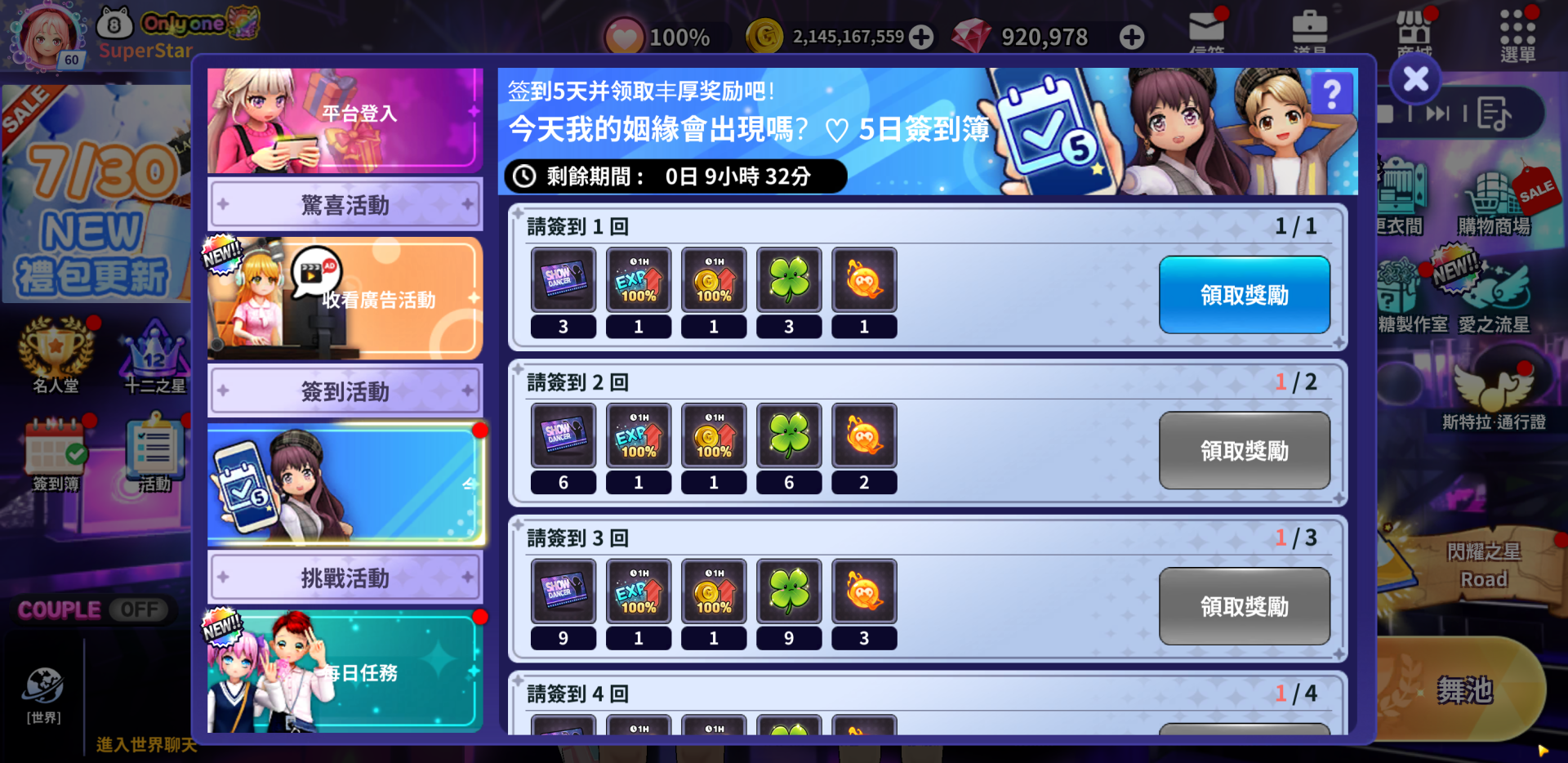 | 5 | 쇼댄서 진행권 15개 EXP 100% 버프(1시간) 1개 골드 100% 버프(1시간) 1개 승급요정 럭끼풀 15개 더블 오버히트 소울 5개 |
