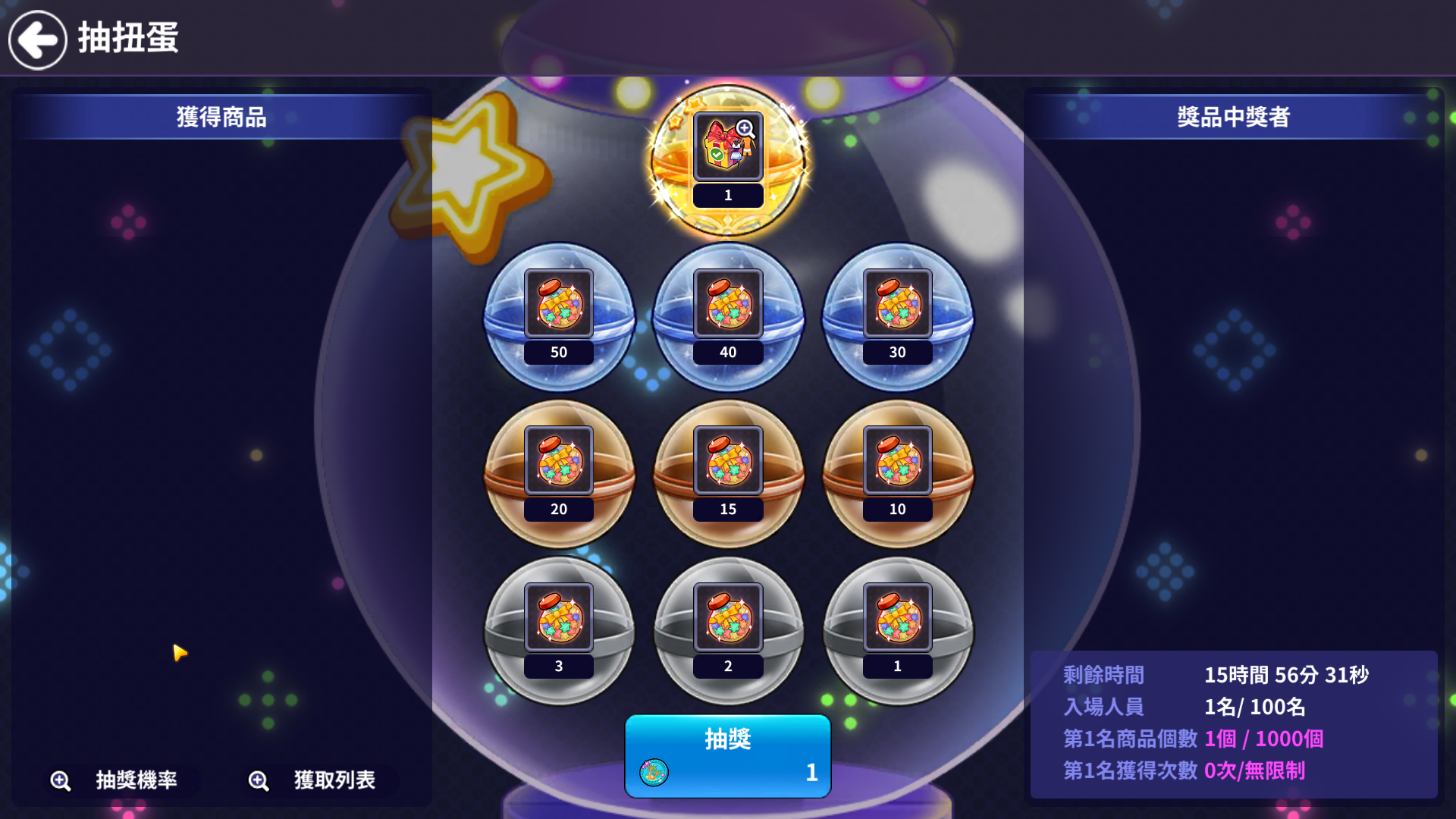 - 1等商品限定的數量全部消耗或進行時間截止時,抽扭蛋也跟著結束。