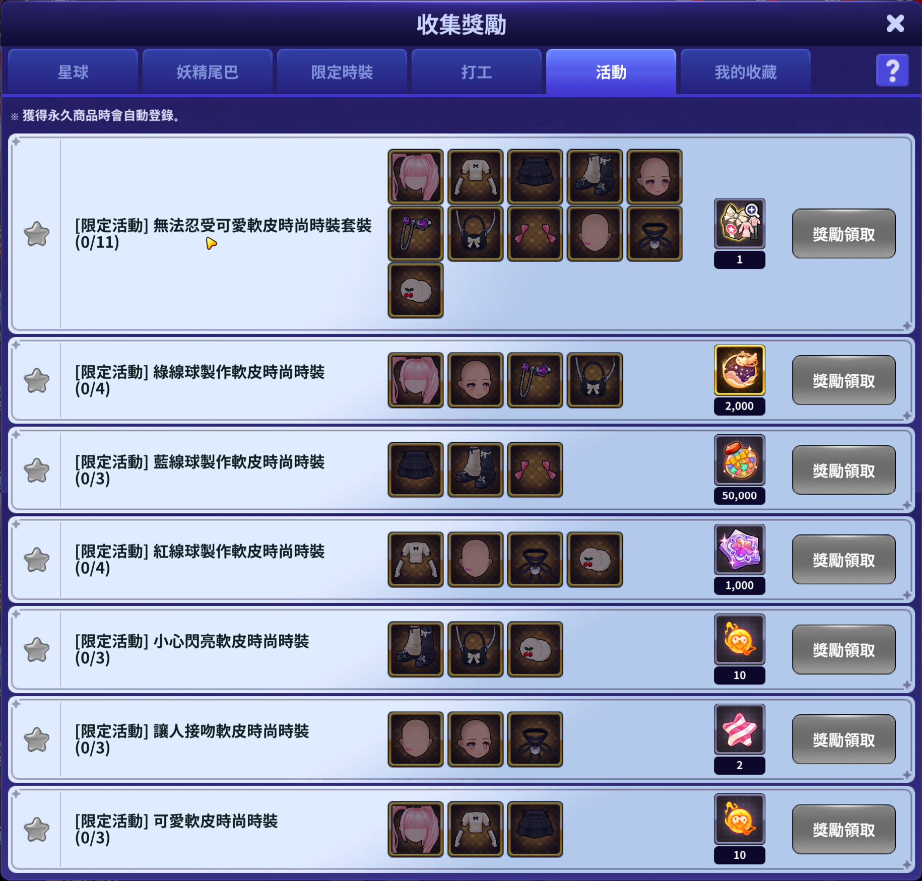 - 獲得符合每個收集獎勵的時裝,當符合條件時,就可以獲得收集獎勵。