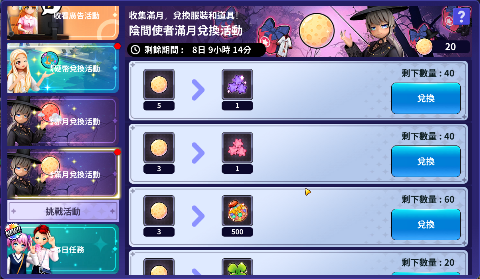 - [主畫面] - [選單] - [活動] - [驚喜活動] - [陰間使者滿月兌換活動]
